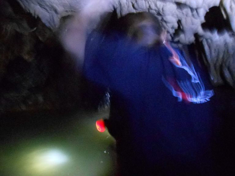 ภายในถ้ำมืดมากๆในถ้ามีน้ำตกไหลผ่านตลอด ทั้งปี ช่วงฝนตก น้ำจะเต็มถ้ำเลยทีเดียว เห็นได้จากเศษกิงไม้ที่ติดอยู่บนเพดานถ้ำ เจ้าหน้าที่อุทยานจะนำทางเราตลอดเส้นทางเพื่อความปลอดภัย